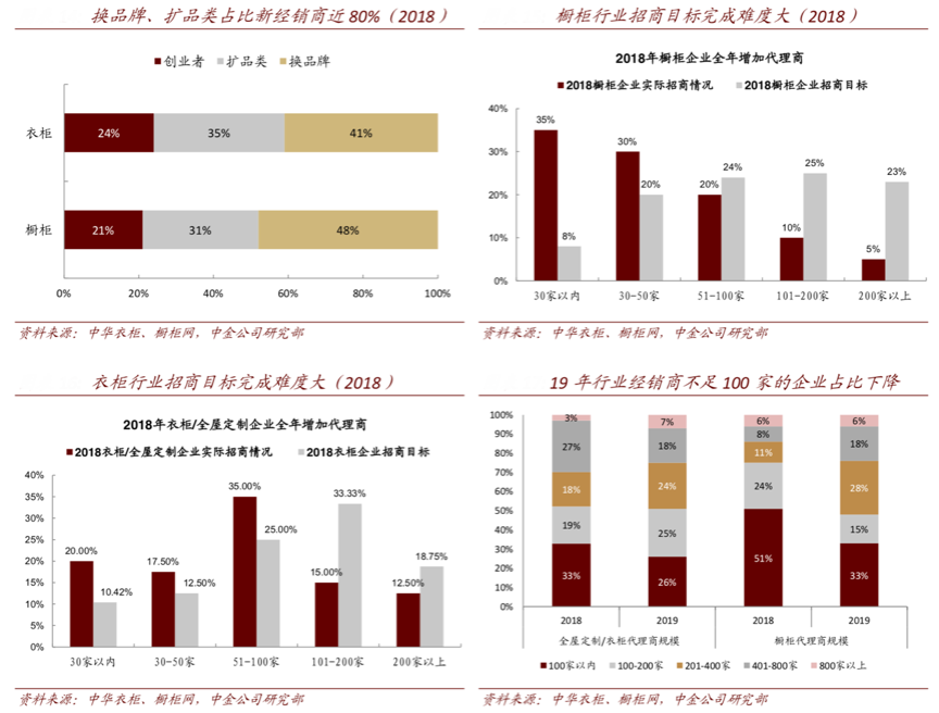 我們已經(jīng)身處數(shù)字化技術驅(qū)動的互聯(lián)網(wǎng)時代,互聯(lián)網(wǎng)家裝電商迅猛發(fā)展,各渠道代理商正在快速發(fā)展,渠道的代理層次升級、招商力度升級等日益凸顯。根據(jù)中華衣柜、櫥柜網(wǎng)和中金公司研究部等綜合資訊表明,2018年換品牌、擴品類經(jīng)銷商的占比已經(jīng)接近80%,優(yōu)質(zhì)經(jīng)銷商向頭部企業(yè)集中。櫥柜、衣柜\全屋定制 2018 年報名加盟商分別有 31%、35%來自擴品類。從 2018 年定制家居行業(yè)企業(yè)招商目標及實際達成結果來看,65%的企業(yè)招商數(shù)量不足 50 家; 衣柜行業(yè) 38% 的企業(yè)招商數(shù)量不足 50 家。