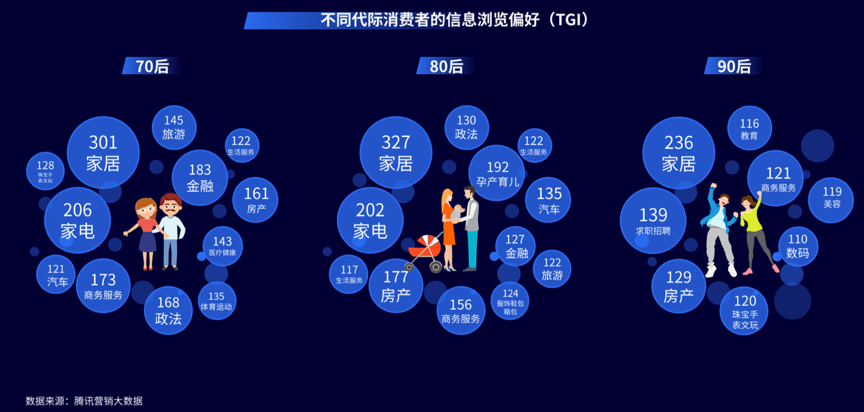 數(shù)字化時(shí)代的“內(nèi)容建設(shè)”需要因消費(fèi)者不同世代而有所不同,“因世代不同”各消費(fèi)者世代的消費(fèi)者關(guān)注點(diǎn)也不同,優(yōu)秀的家裝新零售電商品牌總能因時(shí)而變,提升智能化內(nèi)容推送率。根據(jù)騰訊營銷大數(shù)據(jù)等綜合資訊表明,70后比較關(guān)注家居、家電、金融、商務(wù)等內(nèi)容,80后比較關(guān)注家居、家電、孕產(chǎn)育兒、家庭等內(nèi)容,90后比較關(guān)注家居、求職招聘、房產(chǎn)、個(gè)人等時(shí)尚類內(nèi)容。