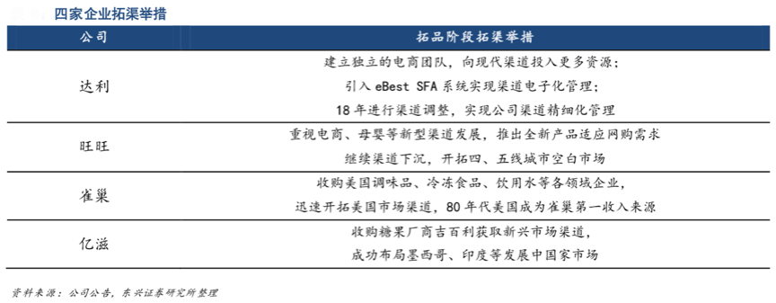 深耕渠道是拓品戰(zhàn)略成功的重要保障,建立健全線上交易、門店體驗(yàn)等全渠道銷售場景是各公司迅猛崛起的重要保障。根據(jù)各公司公告及東興證券研究所等綜合資訊表明,國內(nèi)企業(yè)在拓品過程中,主要依靠擴(kuò)大營銷網(wǎng)絡(luò)和加強(qiáng)渠道下沉來維持自身的渠道優(yōu)勢(shì),國外食飲龍頭則通過并購在拓品的同時(shí)快速實(shí)現(xiàn)拓渠。