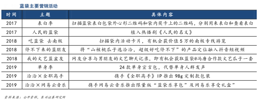 點(diǎn)燃用戶的品牌互動(dòng)熱情,放大品牌的消費(fèi)能量,這是各企業(yè)提升品牌競爭力的“不二法寶”。優(yōu)秀的品牌總是從單一產(chǎn)品的價(jià)值放大開始,強(qiáng)化多產(chǎn)品的“休閑及趣味價(jià)值塑造“,細(xì)化堅(jiān)果炒貨產(chǎn)品賣點(diǎn),點(diǎn)亮消費(fèi)場景,放大產(chǎn)品原料特色,以年輕化包裝、多口味創(chuàng)新及新穎時(shí)尚的營銷活動(dòng)全面彰顯品牌價(jià)值。根據(jù)公司公開資料、東興證券研究所等綜合資訊表明,洽洽食品通過藍(lán)袋產(chǎn)品一系列主題活動(dòng)設(shè)計(jì),亮化藍(lán)袋的二維碼引流設(shè)計(jì),植入《人民的名義》等各項(xiàng)特色,由此亮化品牌形象,贏得了用戶的一致贊許。