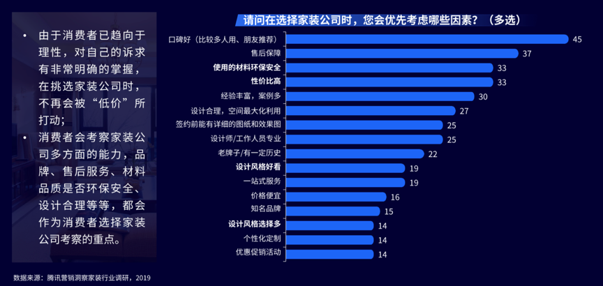 家裝消費(fèi)有其固有的流程,“家裝公司選擇”是無(wú)法回避的一環(huán),也是極關(guān)鍵的一環(huán),其往往成為全屋家裝新零售電商品牌策劃營(yíng)銷的第一步。根據(jù)《2019年騰訊營(yíng)銷洞察家裝行業(yè)調(diào)研》等綜合資訊表明,服務(wù)口碑、售后保障和材料環(huán)保案例等是消費(fèi)者選擇家裝公司的優(yōu)先考慮要素,這些正是家裝企業(yè)品牌策劃營(yíng)銷的關(guān)鍵之處,也是其打造行業(yè)領(lǐng)先品牌的發(fā)力點(diǎn)。