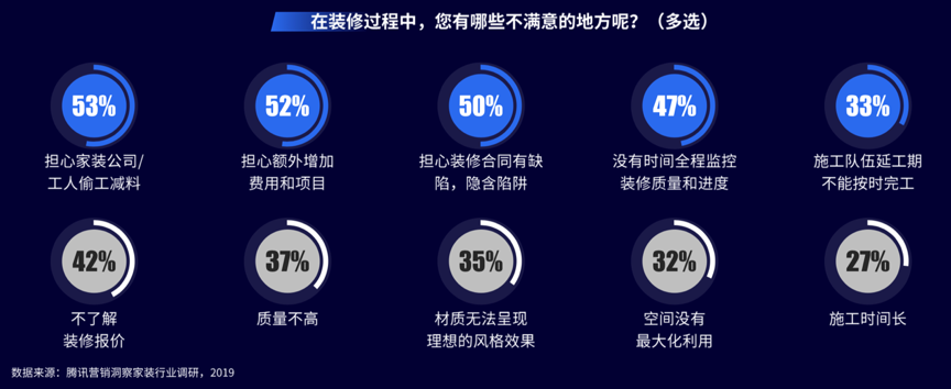 家裝行業(yè)發(fā)展至今,其有自己的行業(yè)規(guī)律,更有自己的行業(yè)痛點(diǎn),行業(yè)之“坑”還是比較多的,這也是用戶對(duì)品牌不信任、不滿意的地方,也正是家裝品牌推進(jìn)家裝新零售新服務(wù)需要“重點(diǎn)解決”之處。根據(jù)《2019年騰訊營(yíng)銷洞察家裝行業(yè)調(diào)研》等綜合資訊表明,多數(shù)消費(fèi)者擔(dān)心家裝公司/工人偷工減料、擔(dān)心額外增加費(fèi)用項(xiàng)目和擔(dān)心裝修合同有缺陷隱含陷阱等。