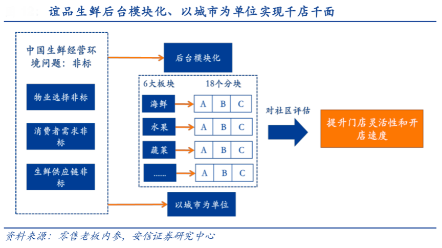 經(jīng)典案例:據(jù)零售老板內(nèi)參、安信證券研究中心等綜合資訊表明,誼品生鮮市場拓展大多會(huì)以城市為單位,在一個(gè)城市就做好每個(gè)家庭,以社區(qū)為落腳點(diǎn)。最終,將難以標(biāo)準(zhǔn)化的生鮮商品納入到標(biāo)準(zhǔn)化的流程中,增加了門店收入,為快速開店打下基礎(chǔ)并實(shí)現(xiàn)“千店千面”。
