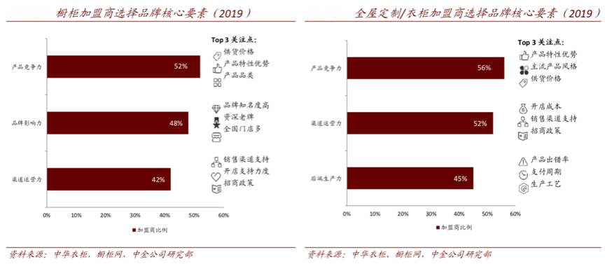 縱觀國內(nèi)創(chuàng)新型渠道管理,無論是櫥柜還是全屋定制類的經(jīng)銷商,其大多關(guān)注產(chǎn)品競爭力,在產(chǎn)品維度內(nèi),更關(guān)心供貨價、性價比、品類、風(fēng)格等家裝要素,在當(dāng)下,基于經(jīng)銷商優(yōu)惠的拿貨折扣、開發(fā)更具性價比的新款產(chǎn)品成為吸引經(jīng)銷商的最主要因素。優(yōu)秀的家裝新零售電商品牌,總有自己的品牌價值訴求、產(chǎn)品特色、主推的明星產(chǎn)品等,根據(jù)中華衣柜、櫥柜網(wǎng)和中金公司研究部等綜合資訊表明,櫥柜加盟商選擇品牌的核心要素在于產(chǎn)品競爭力(占52%)、品牌影響力(占48%)等,而全屋定制/衣柜加盟商選擇品牌的核心要素集中在產(chǎn)品競爭力(占56%)、渠道運(yùn)營力(占52%),各加盟商對于產(chǎn)品、品牌和渠道等是重點(diǎn)關(guān)注的。