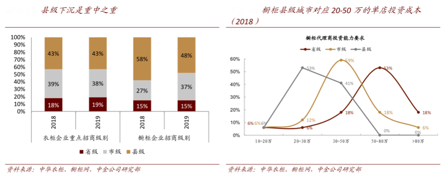 下沉市場極具商業(yè)價值,更是數(shù)字品牌營銷策劃創(chuàng)新的“大天地”,從中華衣柜、櫥柜網(wǎng)、中金公司研究部等綜合資訊表明,2019年櫥柜、衣柜/全屋定制縣級城市招商占比在43%和48%,未來縣級城市的下沉仍然是重中之重,以櫥柜 為例,縣級城市對應(yīng)單店20-50萬元的投資額,較早布局的品牌有望在當(dāng)?shù)孬@得較優(yōu)質(zhì)的經(jīng)銷商資源,實(shí)現(xiàn)優(yōu)勢卡位。