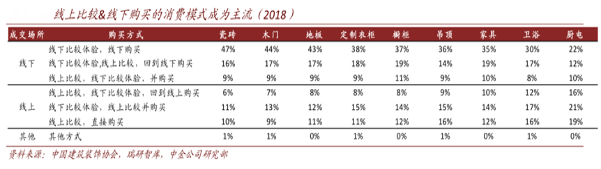 “家裝全渠道銷售場景構(gòu)建”已經(jīng)成為家裝行業(yè)的主流態(tài)勢,專注家裝服務(wù)的強(qiáng)體驗(yàn)性及強(qiáng)服務(wù)感、亮化家裝服務(wù)的口碑——你也可以做得很好!從中國建筑裝飾協(xié)會、瑞研智庫和中金公司研究部等綜合資訊表明,線上比較&線下購買的消費(fèi)模式已經(jīng)成為行業(yè)主流,產(chǎn)品的線上口碑尤為關(guān)鍵,平均來看60%以上的消費(fèi)者會在線上比較之后再購買商品;線下的實(shí)際服務(wù)與體驗(yàn)是能否成交的核心要素,尤其是對于耐用品屬性更強(qiáng)的品類,比如瓷磚、木門、地板、衣柜、櫥柜等,線下成交的占比都接近70%。