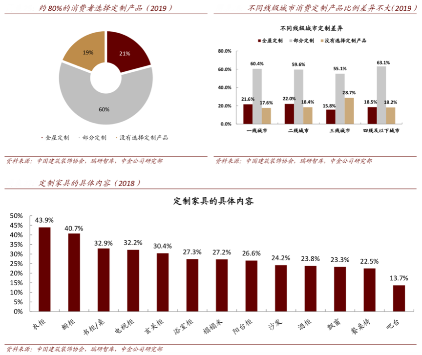 建材家居消費具有一整式、集合式特點,一站式購買、集合式安裝等受到企業(yè)的更多關注,“集合式消費”日益成為建材家居行業(yè)性消費趨勢。根據中國建筑裝飾協會、瑞研智庫、中金公司研究部等綜合資訊表明,約80%的家居消費者會選擇定制產品,三四線下沉市場人群對部分定制家居產品的接受度比較高,其家居消費能力正在逐步崛起。