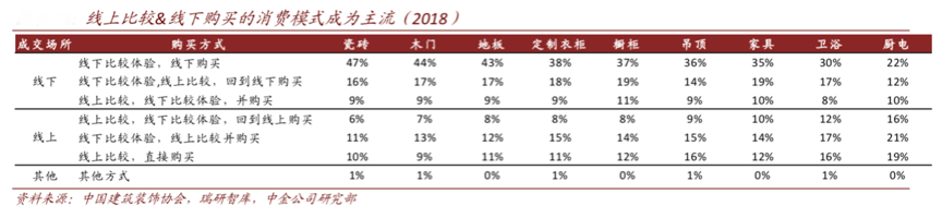 建材家居集合式購買、定制化消費持續(xù)提升,“全屋定制”需求日益旺盛。根據中國建筑裝飾協會、瑞研智庫、中金公司研究部等綜合資訊表明,品類方面超過 40%的消費者會選擇定制衣柜及定制櫥柜,也有超過 30%的消費者會選擇定制的書柜、電視柜和玄關柜,全屋定制需求日益旺盛,值得建材家居電商新零售企業(yè)重點關注。