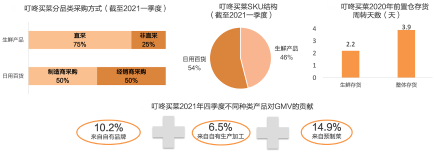 經(jīng)典案例:根據(jù)叮咚買菜招股書、叮咚買菜2021Q4業(yè)績會PPT、天風證券研究所等綜合資訊表明,叮咚買菜產(chǎn)品結(jié)構不斷優(yōu)化,自有品牌、自有生產(chǎn)加工產(chǎn)品、預制菜比重上升。2021年四季度,自有生產(chǎn)加工產(chǎn)品在GMV中占比6.5%,預制菜在GMV中占比14.9%。
