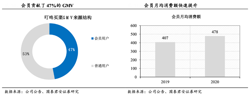 經(jīng)典案例:根據(jù)公司公告、國泰君安證券研究等綜合資訊表明,叮咚買菜會員 GMV 消費(fèi)金額不斷提高,其會員對平臺的認(rèn)可度不斷提高,根據(jù)招股書顯示,2021Q1 平均每月交易用戶 690 萬,其中會員占比為 22%(約 152 萬),會員平均每用戶月均單量 6.7 次,GMV 貢獻(xiàn)比 例為 47%。會員的月消費(fèi)金額由 2019 年的 407 元增長到2020 年的 478 元,呈上升趨勢。