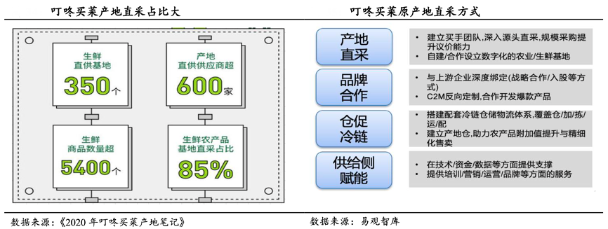 經(jīng)典案例:根據(jù)《2020年叮咚買菜產(chǎn)地筆記》、易觀智庫、國泰君安證券研究等綜合資訊表明,叮咚買菜重倉供應(yīng)鏈,通過產(chǎn)地直采、品牌合作,自己建立中心大倉、加工中心和冷鏈物流等方式來強(qiáng)化供應(yīng)鏈,并且利用自身積累的技術(shù)和經(jīng)驗(yàn)賦能供給側(cè)。目前其建立了 350 個(gè)直供基地,產(chǎn)地直供供應(yīng)商600 多家,生鮮直采比例達(dá)到79%。