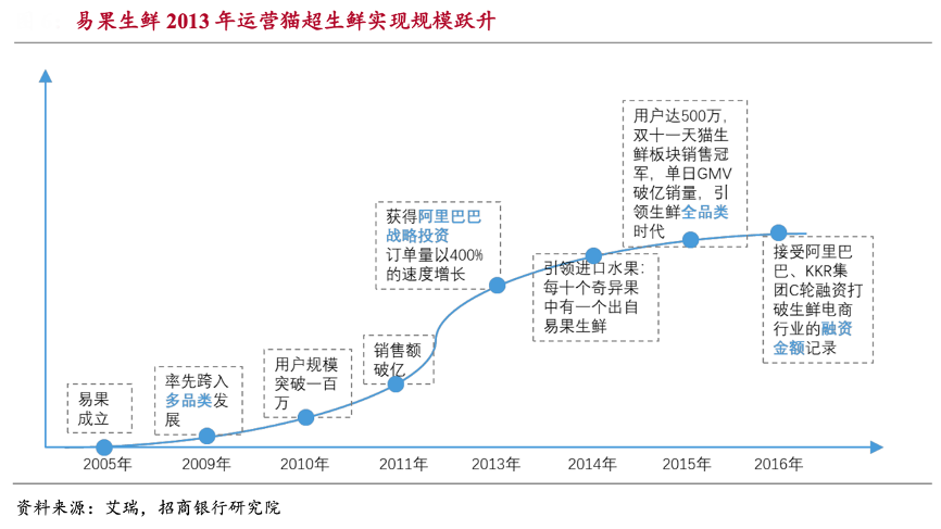 經(jīng)典案例:根據(jù)盒馬官網(wǎng)、招商證券、招商銀行研究院等綜合資訊表明,天貓超市生鮮、京東生鮮的物流體系支持其覆蓋更多城市,并且下單后半天或 1 天可送達(dá),收貨范圍和時(shí)效性都顯著提升。例如,易果生鮮在 2013 年以前發(fā)展相對(duì)緩慢,隨后被阿里收購并接手天貓超市生鮮運(yùn)營(yíng)權(quán)后,當(dāng)年訂單量增長(zhǎng) 4 倍,并快速拉開與同期其它垂直生鮮電商 GMV 距離。