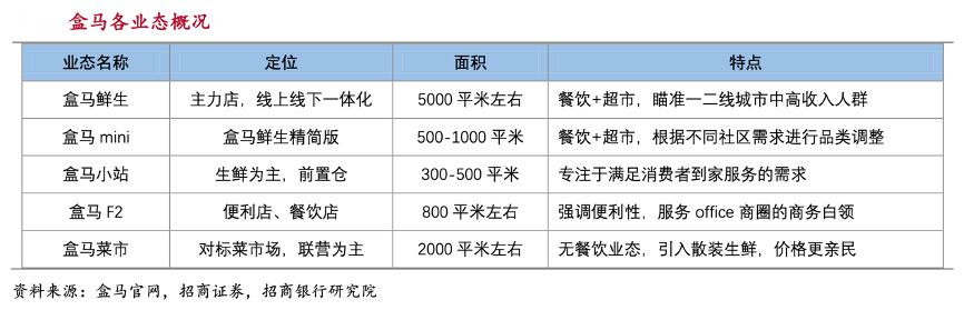 經(jīng)典案例:根據(jù)艾瑞、招商銀行研究院等綜合資訊表明,新零售的代表企業(yè)盒馬通過裂變更“小”的店型探索復(fù)制和下沉。2019年初其在盒馬鮮生大店的基礎(chǔ)上發(fā)展出盒馬菜市、盒馬 mini、盒馬小站、盒馬 F2 四種新業(yè)態(tài);其中盒馬 mini 是盒馬的小店業(yè)態(tài),面積為 500 m²-1000 m²,約 3000 個(gè) SKU,配送范圍縮短至 1.5 公里;盒馬小站是前置倉模式,面積為300 m²-500 m²。