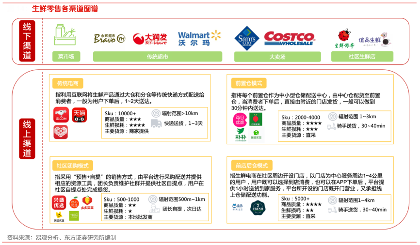 經(jīng)典案例:根據(jù)易觀分析、東方證券研究所等綜合資訊表明,生鮮零售大致可分為線上及線下渠道,各渠道主打不同消費(fèi)場景: