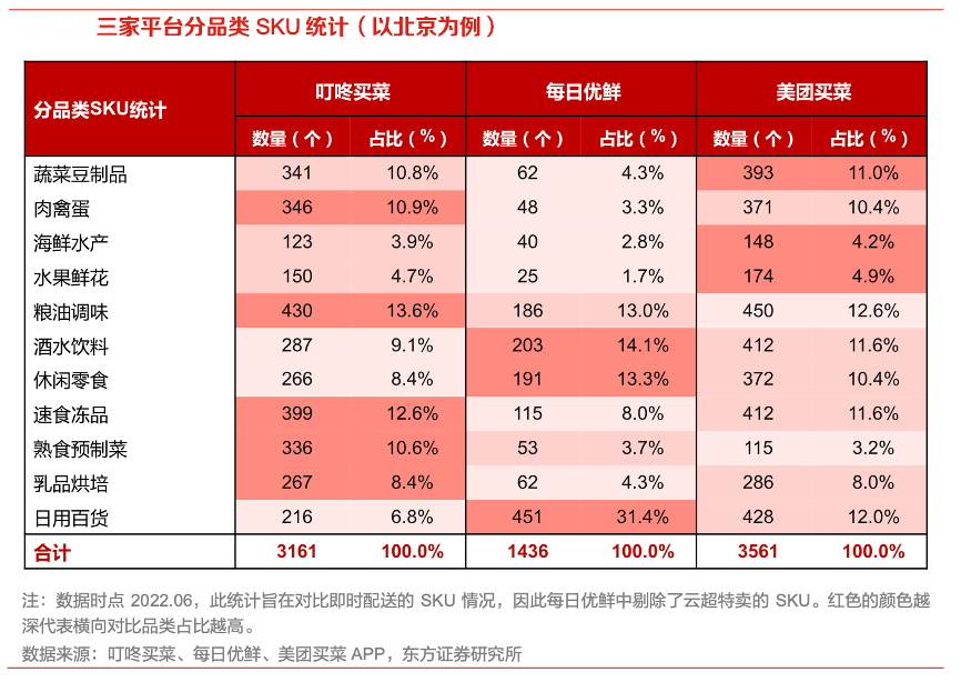經典案例:根據叮咚買菜、每日優(yōu)鮮、美團買菜APP、東方證券研究所等綜合資訊表明,在商品品類結構方面,叮咚主打自有品牌提高客單價,多速食凍品、熟食預制菜、乳品烘培品類商品,其合計 SKU 占比約為 31.6%,而美團買菜 SKU 品類結構相對均衡,傳統(tǒng)生鮮占比相對較高,其在戰(zhàn)略上維穩(wěn)平衡,提高客單價更多依靠向用戶提供豐富均衡的品類選擇。