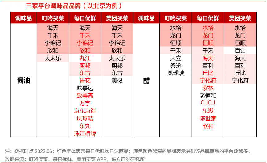 經典案例:根據叮咚買菜、每日優(yōu)鮮、美團買菜APP、東方證券研究所等綜合資訊表明,叮咚買菜和美團買菜的標品選品多集中在較知名的品牌,且同類型商品下品牌數有所控制。