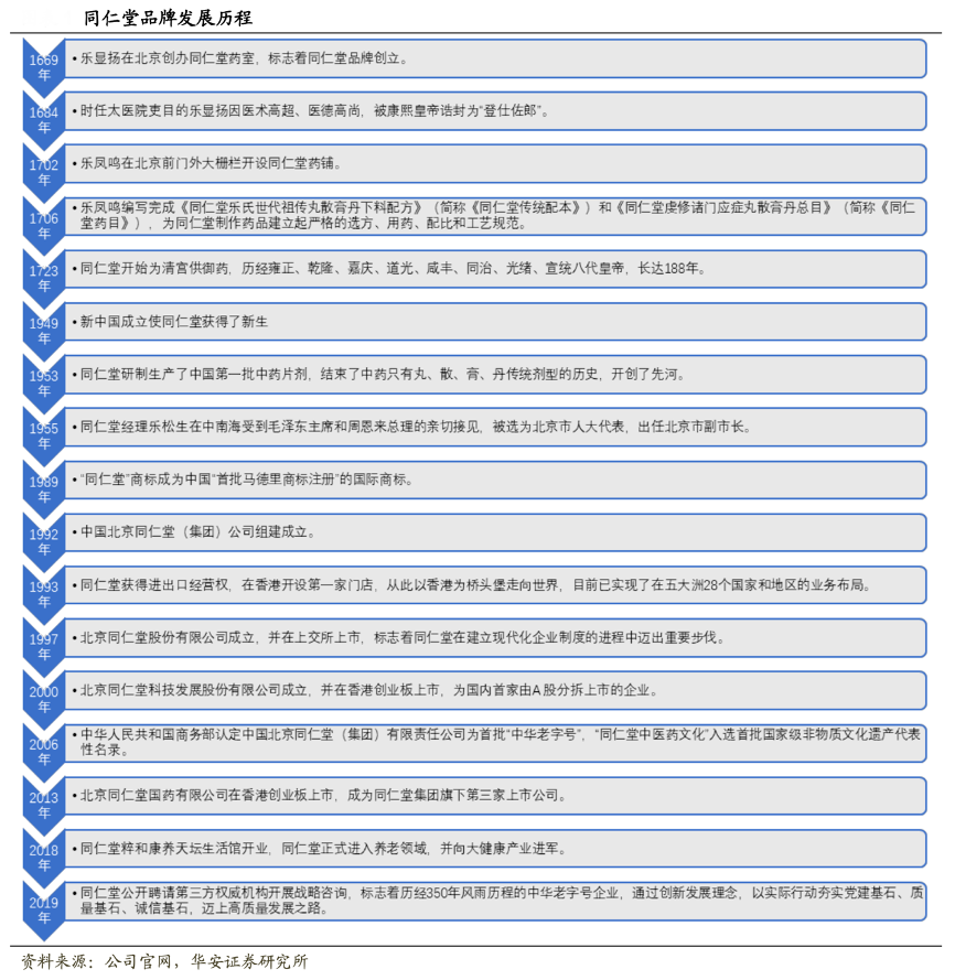 經(jīng)典案例:根據(jù)公司官網(wǎng)、華安證券研究所等綜合資訊表明,同仁堂品牌始創(chuàng)于 1669 年(清康熙八年),至今已有 352 年歷史,自 1723 年(清 雍正元年)為清宮供御藥。同仁堂集團(tuán)作為首批中華老字號(hào)企業(yè),1992年中國(guó)北京同仁堂集團(tuán)公司組建并于2001年改制為國(guó)有獨(dú)資公司,1997 年旗下同仁堂股份在 上海上交所上市,2000 年同仁堂科技在香港聯(lián)交所上市,2013 年同仁堂國(guó)藥在香 港聯(lián)交所上市。