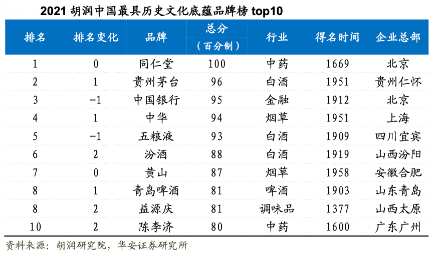 經(jīng)典案例:根據(jù)胡潤(rùn)研究院、華安證券研究所等綜合資訊表明,2021 年 10 月胡潤(rùn)研究院發(fā)布《2021 胡潤(rùn)中國(guó)最具歷史文化底 蘊(yùn)品牌榜》,該榜單調(diào)研范圍涵蓋中國(guó)內(nèi)地具有 60 年以上歷史的為消費(fèi)者提供產(chǎn)品或服務(wù)的品牌,綜合考察品牌歷史、價(jià)值和文化內(nèi)涵三個(gè)維度,以每個(gè)品牌的總分(百分制)進(jìn)行排名。同仁堂以滿(mǎn)分位列榜首,凸顯其自身的品牌價(jià)值。