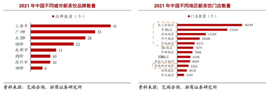 經(jīng)典案例:根據(jù)艾瑞咨詢、浙商證券研究所等綜合資訊表明,按地域分布來看,中國南方市場茶飲門店分布較北方更密,北方、中西部市場仍有較大拓展空間。根據(jù)艾瑞咨詢,2021年長三角地區(qū)茶飲門店數(shù)量超過 3 萬家,而華北地區(qū)茶飲門店數(shù)量僅為 3 千余家,北方消費者心智占領程度偏低。