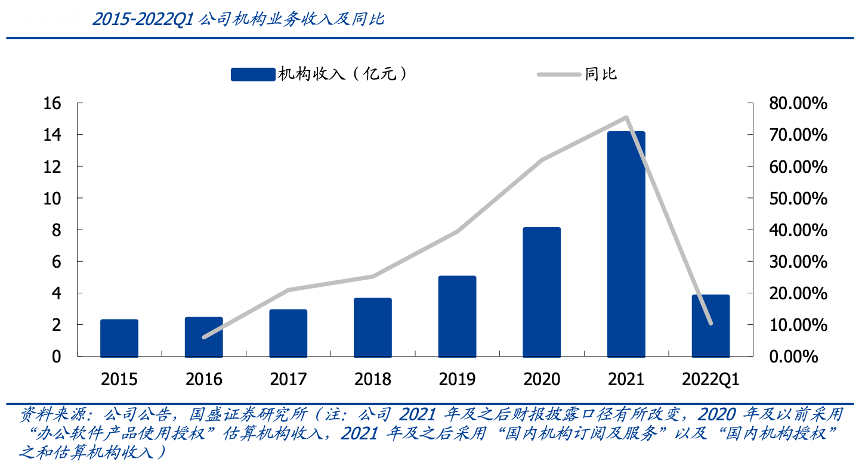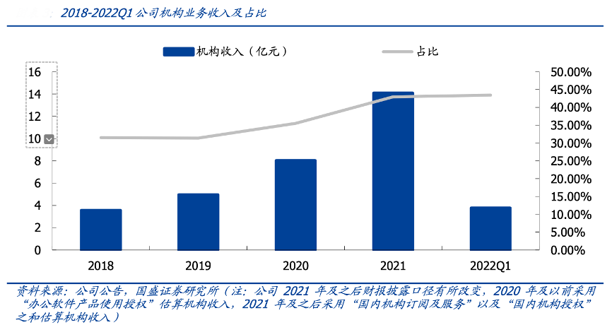 經(jīng)典案例:根據(jù)公司公告、國盛證券研究所等綜合資訊表明,金山辦公公司機構(gòu)收入占比不斷提升,2022Q1 達到 43%。在正版化、信創(chuàng)、云與協(xié)作等多重 因素推動下,公司機構(gòu)占比收入不斷提升。2022Q1,公司國內(nèi)機構(gòu)業(yè)務(wù)收入達到 3.77 億 元,占收入比例達到 43.43%。