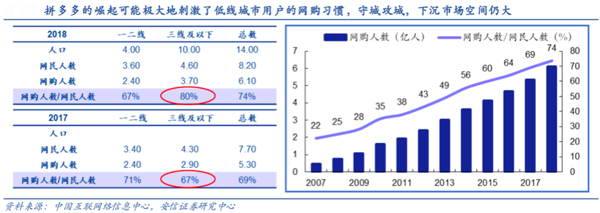 三四線市場(chǎng)用戶有自己的消費(fèi)習(xí)慣,有自己的消費(fèi)特色,這是企業(yè)經(jīng)營(yíng)三四線市場(chǎng)品牌營(yíng)銷策劃時(shí)需要重點(diǎn)關(guān)注的。據(jù)中國(guó)互聯(lián)網(wǎng)絡(luò)信息中心、安信證券研究中心等綜合資訊表明,在拼多多現(xiàn)有用戶中,其已基本完成了三線及以下網(wǎng)購(gòu)用戶的覆蓋;另一方面,我們從以下數(shù)據(jù)中發(fā)現(xiàn),拼多多的崛起可能極大地刺激了低線城市用戶的網(wǎng)購(gòu)習(xí)慣。