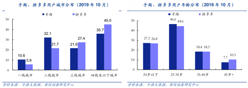 以手淘為代表的大平臺(tái)在三四線市場(chǎng)運(yùn)作中占據(jù)“優(yōu)勢(shì)競(jìng)爭(zhēng)地位”,其依靠平臺(tái)的流量?jī)?yōu)勢(shì)、用戶優(yōu)勢(shì)等引領(lǐng)風(fēng)潮。根據(jù)個(gè)推大數(shù)據(jù)、安信證券研究中心等綜合資訊表明,2019年10月,51.4%的手淘用戶為拼多多用戶,78.3%的拼多多用戶為手淘用戶,拼多多用戶 72.4%來自三線及以下城市,而手淘三線及以下城市用戶占比為 57.3%。拼多多一二線客戶占比較低,且阿里系用戶有近半數(shù)仍未下載拼多多 APP,拼多多通過百億補(bǔ)貼進(jìn)一步滲透一二線用戶和手淘用戶仍有較大空間。