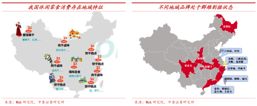 根據(jù)Mob研究院、中泰證券研究所等綜合資訊表明,我國(guó)休閑零食品消費(fèi)存在地域性特征,地域食品品牌尚處于“群雄割據(jù)”的狀態(tài),東部沿海地區(qū)以餅干糕點(diǎn)及肉類鹵味為主,西北地區(qū)以蜜餞果干類為主,長(zhǎng)三角與珠三角是休閑食品品牌聚集地,而在其他地區(qū)亦分布有當(dāng)?shù)仄放?,因此線下市格局較為散亂,行業(yè)正處于區(qū)域龍頭品牌群雄割據(jù)、行業(yè)領(lǐng)先品牌走向全國(guó)的分化成長(zhǎng)階段。