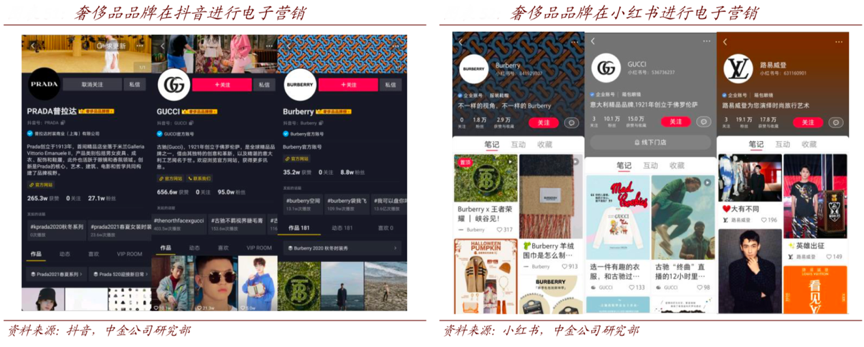 經(jīng)典案例:根據(jù)抖音、小紅書、中金公司研究部等綜合資訊表明,數(shù)字化渠道來看,奢侈品牌在中國仍主要依賴自營的 brand.com 進(jìn)行線上銷售,而社交網(wǎng) 絡(luò)平臺(tái)諸如抖音、微信、小紅書等主要用于觸達(dá)消費(fèi)群體和市場營銷(“種草”),之后將由社交平臺(tái)導(dǎo)流至品牌官網(wǎng)。