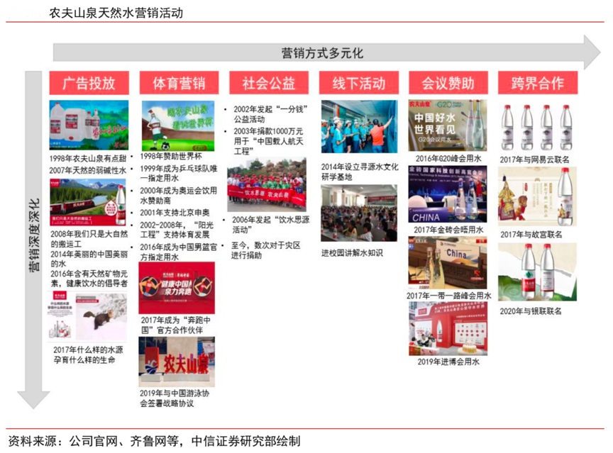 經(jīng)典案例:根據(jù)公司官網(wǎng)、中信證券研究部等綜合資訊表明,農(nóng)夫山泉營(yíng)銷(xiāo)方式逐步多元化,從早期主要依靠電視投放&體育營(yíng)銷(xiāo),發(fā)展出線下活動(dòng)、贊助會(huì)議、跨界合作等更多方式。公司在水源地周邊共建設(shè)有水情教育基地13座,累積接待量已達(dá)350萬(wàn)人。