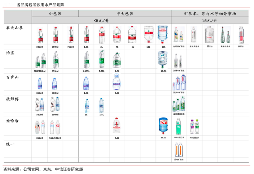 經(jīng)典案例:根據(jù)公司官網(wǎng)、中信證券研究部等綜合資訊表明,農(nóng)夫山泉在包裝飲用水布局上兼具廣度和深度,一方面在包裝規(guī)模的設(shè)計上 SKU 最寬、最密,覆蓋各個消費場景;另一方面推出差異化產(chǎn)品(嬰兒水和鋰水)和高端化產(chǎn)品(天然礦泉水的運動蓋裝和玻璃瓶)。