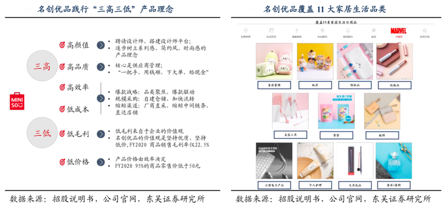 經(jīng)典案例:根據(jù)招股說明書、公司官網(wǎng)、東吳證券研究所等綜合資訊表明,名創(chuàng)優(yōu)品正在持續(xù)的踐行“三高三低”,即高品質(zhì)、高顏值、高效率和低成本、低毛利、低價格的產(chǎn)品理念。截至 2020 年 6 月名創(chuàng)優(yōu)品共有約8,000 個核心 SKU,覆蓋了包括家居裝飾品、小型電子用品、紡織、配件、美容工具、化妝品、玩具、個護、零食、香水、文具等 11 個品類家居日用品類。