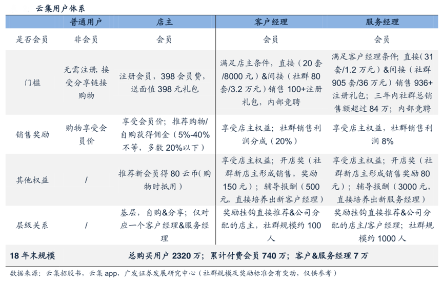 經(jīng)典案例:根據(jù)云集招股書、云集app、廣發(fā)證券發(fā)展研究中心等綜合資訊表明,除普通購買用戶外,云集會員體系分為三級:即店主→客戶經(jīng)理→服務(wù)經(jīng)理,且平臺規(guī)定每位店主僅唯一 對應(yīng)一位客戶經(jīng)理和服務(wù)經(jīng)理。