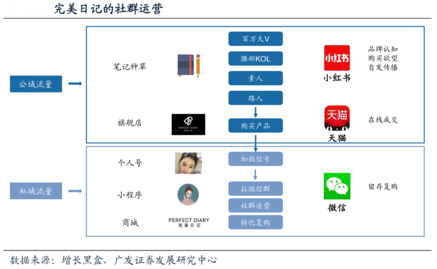 經(jīng)典案例:根據(jù)增長黑盒、廣發(fā)證券發(fā)展研究中心等綜合資訊表明,在小紅書MAU增長趨緩之后,完美日記開始挖掘抖音、淘寶直播、B站等新渠道的 流量價(jià)值;公域流量增長放緩之后開始加速私域流量社群運(yùn)營。2018年下半年開始, 完美日記開始增加其他流量平臺的投放,2018年年底品牌在淘寶直播的轉(zhuǎn)化就超過 了在小紅書的轉(zhuǎn)化。