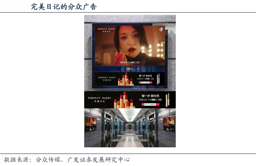 經(jīng)典案例:根據(jù)分眾傳媒、廣發(fā)證券發(fā)展研究中心等綜合資訊表明,配合品牌高端化的節(jié)奏,官宣周迅為代言人之后,完美日記開始加大在分眾上的廣告投放力度,同時(shí)2020年以來其線下體驗(yàn)店費(fèi)用開始明顯增長。根據(jù)招股說明書數(shù)據(jù),截止2020/9/30,完美日記線下體驗(yàn)店的數(shù)據(jù)已經(jīng)增至202個(gè)。