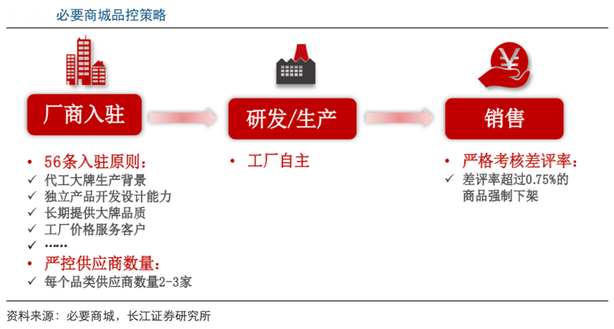 經(jīng)典案例:根據(jù)必要商城、長江證券研究所等綜合資訊表明,入駐必要商城需要滿足 56 條標(biāo)準(zhǔn),“有代工大牌的生產(chǎn)制造背景”、“擁有獨(dú)立 產(chǎn)品開發(fā)設(shè)計(jì)能力”、“有長期提供大牌品質(zhì)的恒心”和“有工廠價格服務(wù)用戶的思維”等條件突出。同時,公司嚴(yán)格控制每個品類的供應(yīng)商數(shù)量不超過 2-3 家,給廠商提供壟斷垂直品類市場的機(jī)會,以此降低競爭壓力,而廠商也無需投放流量廣告、參與促銷等活動,從而使廠商能更專注做好產(chǎn)品。