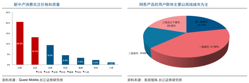 經(jīng)典案例:根據(jù)Quest Mobile、長江證券研究所等綜合資訊表明,新中產(chǎn)消費(fèi)關(guān)注點(diǎn)主要在于“價格及品質(zhì)”,而對品牌、時尚等方面的關(guān)注度相對較低。而以網(wǎng)易嚴(yán)選、小米有品等為代表的好用不貴的“精品電商”開始在一線城市快速滲透,易觀數(shù)據(jù)顯示網(wǎng)易嚴(yán)選用戶構(gòu)成中60%以上處于超一線及一線城市,而其三線及以下城市占比僅為20%。