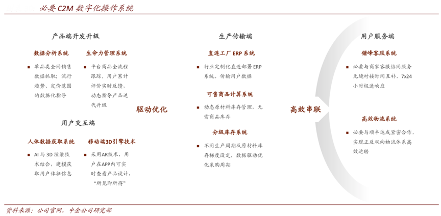 經(jīng)典案例:根據(jù)公司官網(wǎng)、中金公司研究部等綜合資訊表明,必要打造了一整套面向產(chǎn)品端、用戶端以及生產(chǎn)端的 C2M 底層操作系統(tǒng),通過數(shù)據(jù)化編譯消費(fèi)者需求直連生產(chǎn),改造制造商能力矩陣并優(yōu)化消費(fèi)者體驗(yàn)。