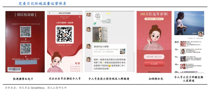 經(jīng)典案例:根據(jù)增長黑盒Growthbox、國元證券研究所等綜合資訊表明,以彩妝品牌完美日記為例,品牌通過產(chǎn)品附帶的二維碼作為流量入口,利用微信群 與個人客服號構建私域流量運營體系,實現(xiàn)了深度消費者溝通。消費者在完美日記首次完成購買后會收到附帶的紅包卡,引導客戶關注完美日記公眾號和個人客服“小完子”,其個人號“小完子”是有獨立人設的美妝顧問,她的朋友圈會發(fā) 美妝教程、素顏自拍、產(chǎn)品圖片,同時為客戶解答疑問,分享優(yōu)惠。