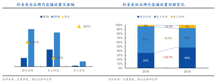 經(jīng)典案例:根據(jù)巨量算數(shù)、國元證券研究所等綜合資訊表明,2018年以來,以抖音、快手為代表的短視頻平臺開始加速商業(yè)化,成為新興紅利營銷媒介,2020 年抖音、快手的 DAU 分別突破 6 億 與 3 億,成為最普及的內(nèi)容平臺之一,各大美妝品牌紛紛入局,加大在核心短視頻平臺的投放。2019 年,抖音美妝品牌年度關注量較 2018 年增長了 166%,其中國際品 牌與本土傳統(tǒng)品牌增長更明顯,內(nèi)容播放量同比增速分別達到 261%與 427%。