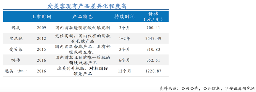 經(jīng)典案例:根據(jù)公司公告、公開信息和華安證券研究所等綜合資訊表明,愛美客專注于玻尿酸產(chǎn)品生產(chǎn),其目前共有6款玻尿酸系列產(chǎn)品在售,產(chǎn)品差異化程度較高,嗨體作為目前國內(nèi)唯 一獲批的頸紋改善產(chǎn)品,考慮到牌照獲批時間,預(yù)計未來5年內(nèi)公司能夠獨占這一細分賽道。