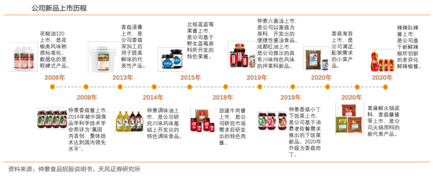 經(jīng)典案例:根據(jù)仲景食品招股說明書、天風證券研究所等綜合資訊表明,仲景香菇醬是公司的明星產(chǎn)品,香菇種植加工是當?shù)毓舅诘睾幽鲜∥鲘{縣的龍頭產(chǎn)業(yè)。鮮香菇加工為干香菇時留下的香菇柄,因其營 養(yǎng)價值、可加工特性等,成為具有產(chǎn)地優(yōu)勢的特色資源,2008 年,仲景香菇醬上市。2018-2019 年,公司陸續(xù)推出牛肉醬、香菇小丁、藍莓醬、成都紅油等調味食品,形成系列化產(chǎn)品組合。