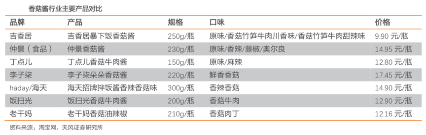 經(jīng)典案例:根據(jù)淘寶網(wǎng)、天風證券研究所等綜合資訊表明,仲景擁有“香菇綜合加工利 用技術”、“線性控溫炒醬技術”等核心技術,并除原味外開發(fā)出香辣、藤椒、奧爾良等豐富口味, 以適應消費者多元化的口味偏好。仲景憑借技術優(yōu)勢保證產(chǎn)品質量,仲景香菇醬價格高于主要產(chǎn)品的平均水平,在消費者追求食品品質、傾向于高端化的趨勢下,仲景香菇醬擁有較好的增長潛力。