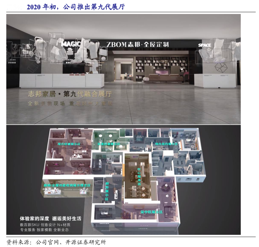 經(jīng)典案例:根據(jù)公司公告、開源證券研究所、等綜合資訊表明,2020 年初,志邦家居推出“第九代展廳”,主打“以融合為主題,以年輕為導(dǎo)向,以簡約為趨勢”,為經(jīng)銷商的展廳更新提供了良好的模板。
