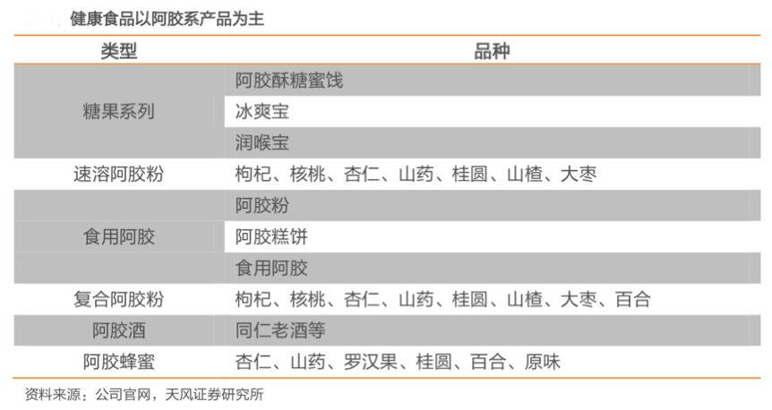 經(jīng)典案例:根據(jù)公司官網(wǎng)、天風證券研究所等綜合資訊表明,同仁堂公司健康食品的開發(fā)以阿膠系產(chǎn)品為主,主張“藥食同源”理念,包括了糖果系列、速溶阿膠粉、食用阿膠、阿膠酒、復合阿膠粉和阿膠蜂蜜等多種健康食品。