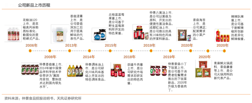 經(jīng)典案例:根據(jù)仲景食品招股說明書、天風(fēng)證券研究所等綜合資訊表明,自成立以來,仲景食品就不斷推陳出新,2006 年,花椒油 120 上市;2008 年,仲景香菇醬上市;2018-2019 年,其陸續(xù)推出牛肉醬、香菇小丁、藍(lán)莓醬、成都紅油等調(diào)味食品,市場反響良好,形成了新的利潤增長點(diǎn)。