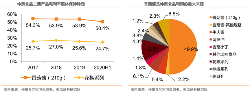 經(jīng)典案例:根據(jù)仲景食品招股說明書、天風(fēng)證券研究所等綜合資訊表明,從毛利角度看,2020H1調(diào)味食品對主營業(yè)務(wù)毛利貢獻(xiàn)率為 66.80%,其中香菇醬(210g) 是公司主營業(yè)務(wù)利潤的最大來源,毛利貢獻(xiàn)率達(dá)到 49.87%,香菇醬的毛利率趨勢對公司整體有較大影響力。