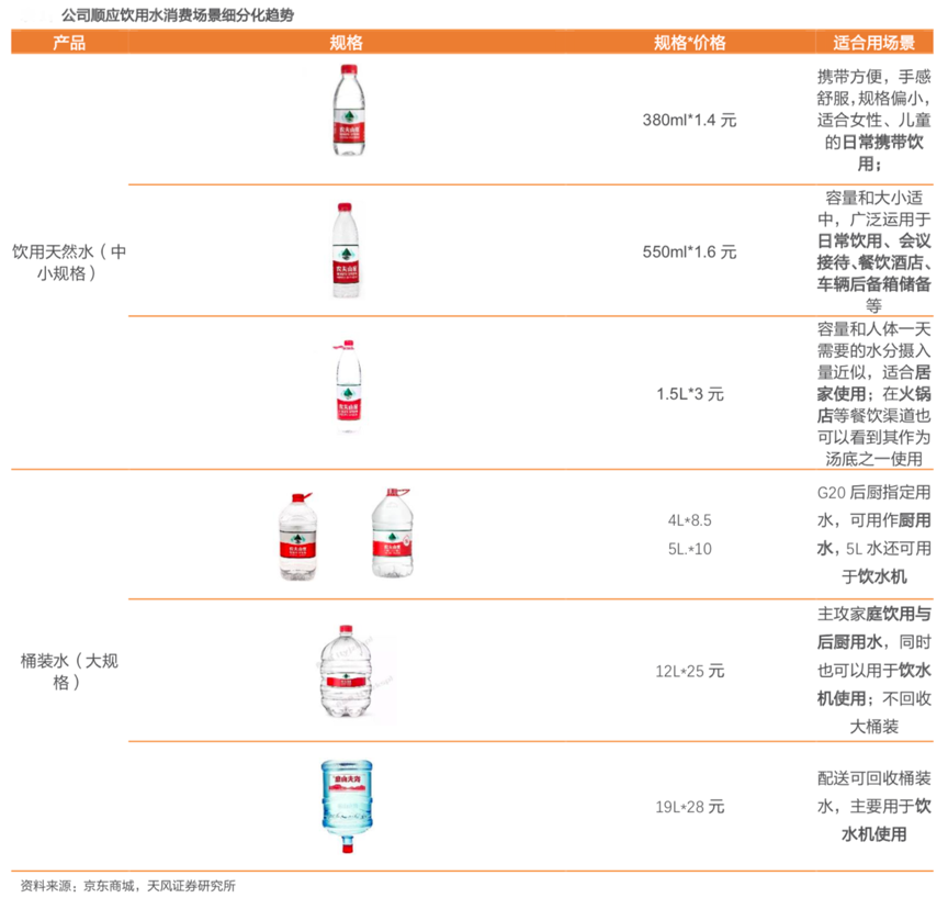 經(jīng)典案例:根據(jù)京東商城、天風(fēng)證券研究所等綜合資訊表明,隨著居民健康意識的逐漸增強(qiáng)以及對高生活品質(zhì)的追求,廚用水、日飲水等家庭場景用水質(zhì)量得到越來越多消費者的關(guān)注;農(nóng)夫山泉順應(yīng)飲用水消費場景細(xì)分化趨勢,產(chǎn)品涵蓋了各種380ml、550ml、1500ml、4L、5L、12L、19L等多種規(guī)格,家用消費、商用消費及小規(guī)格攜帶消費等多種消費場景基本已經(jīng)涵蓋,“產(chǎn)品全消費場景價值”突出。