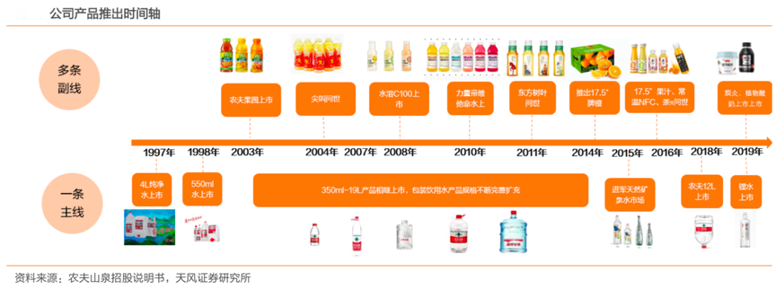 經(jīng)典案例:根據(jù)農(nóng)夫山泉招股說明書、天風(fēng)證券研究所等綜合資訊表明,2012 年-2019年,農(nóng)夫山泉連續(xù)八年保持中國包裝飲用水市場占有率第一,以2019 年零售額計,農(nóng)夫山泉在茶飲料、功能飲料及果汁飲料的市場份額均居中國市場前三位,其已經(jīng)形成多元化產(chǎn)品矩陣,除飲用水外,已經(jīng)布局即飲茶、功能飲料、果汁、植物蛋白、咖啡類等多品類成長矩陣。
