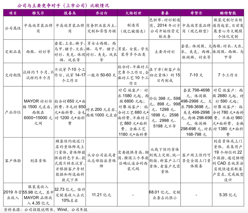 經(jīng)典案例:根據(jù)公司招股說明書、wind、公司年報、光大證券研究等綜合資訊表明,一些成衣品牌順應(yīng)市場需求將業(yè)務(wù)延伸到定制服裝產(chǎn)品,推出了定制系列或定制子品牌(如報喜鳥、雅戈爾等),同時行業(yè)內(nèi)已著手進(jìn)行服裝大規(guī)模個性化定制業(yè)務(wù),并取得了一定成績的上市公司(或曾經(jīng)上市)主要有雅戈爾、報喜鳥、喬治白、大楊創(chuàng)世、魯泰紡織以及希努爾等。