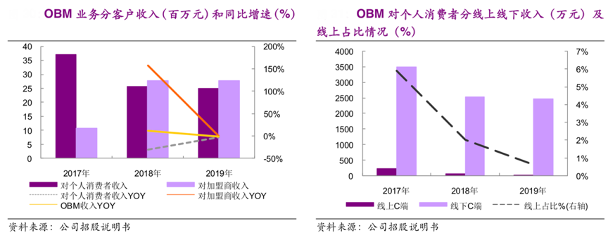 典型現(xiàn)象:根據(jù)公司招股說明書、光大證券研究等綜合資訊表明,酷特智能公司 OBM 業(yè)務(wù)可按客戶分為個人消費者和加盟商,2019年 OBM 模式下對個人消費者和對加盟商的收入分別為 2495 萬元、2794萬元,規(guī)?;鞠喈?dāng)、分別占 OBM 業(yè)務(wù)收入比例為 47%、53%。近三年來公司直營 比例下降(對個人消費者收入持續(xù)下滑),加盟占比則持續(xù)提升,2017~2019 年末公司直營店分別為 16 家、8 家、5 家呈逐步 收縮態(tài)勢,2019 年末的 5 家直營店分布于北京、青島(3 家)、即墨。收入分渠道來看,對個人消費者收入絕大多數(shù)為線下,線上占比較低、2019 年占對個人消費者收入不到 1%。